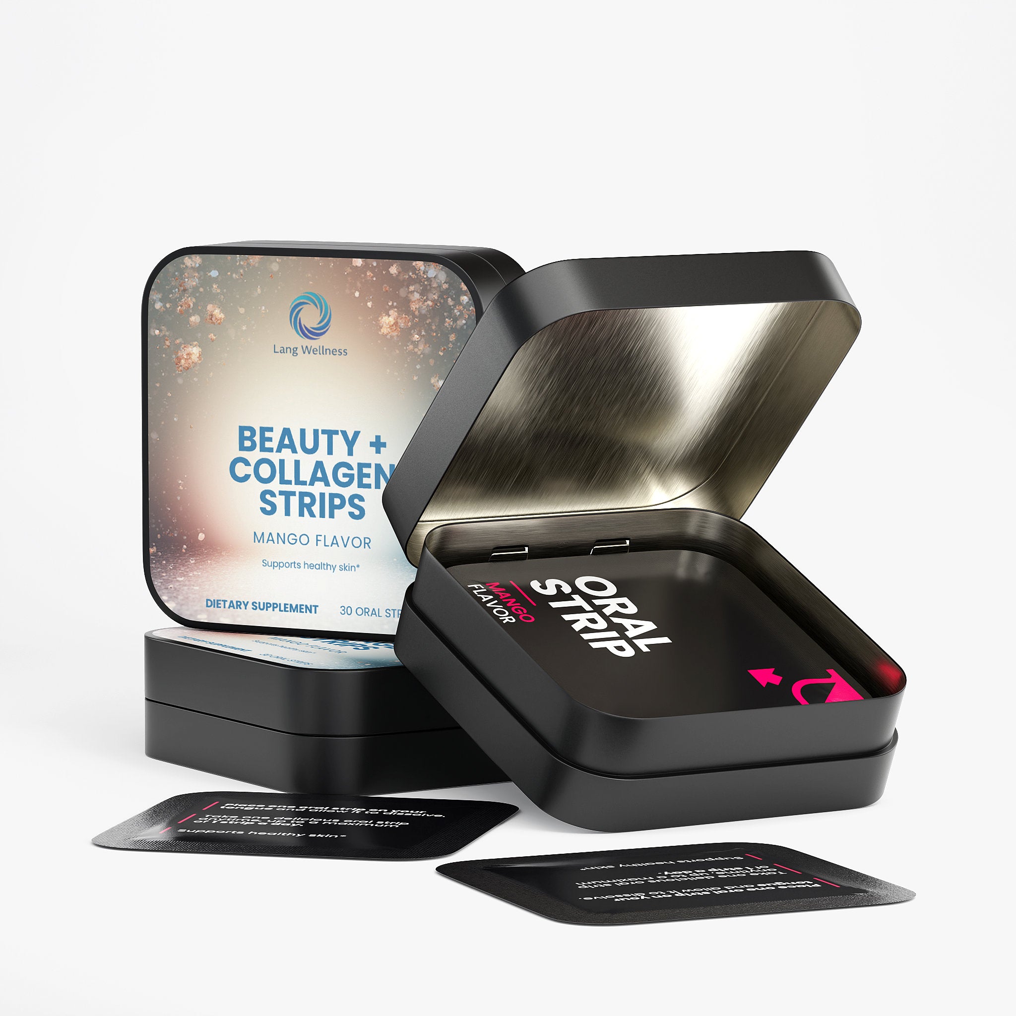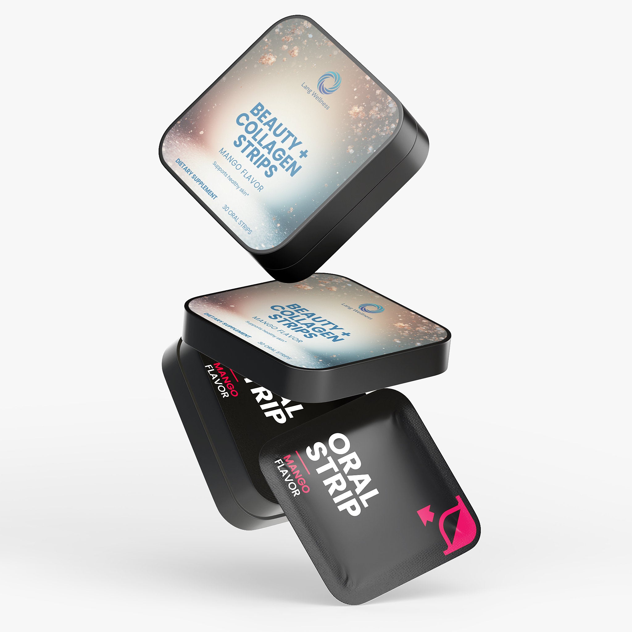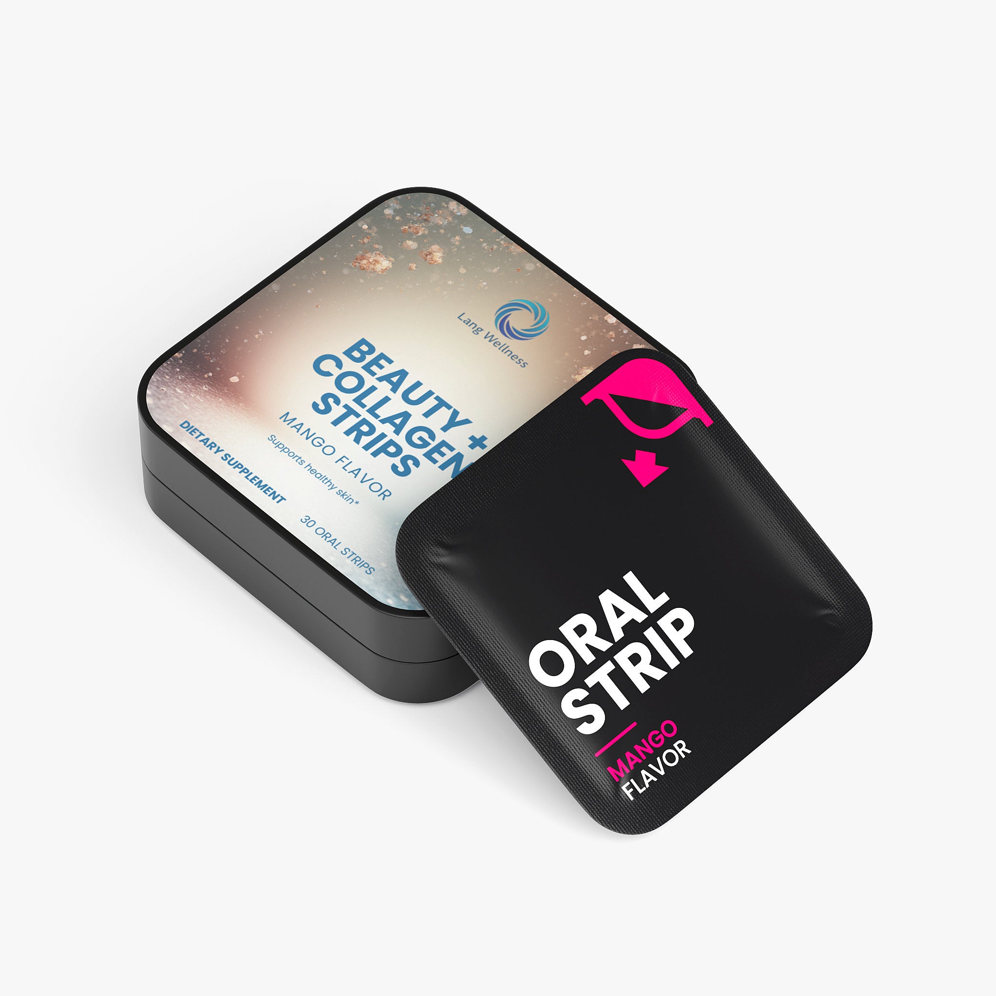 A convenient oral strip supplement delivering collagen peptides and vitamin E in a dissolvable format. Each mango-flavored strip provides 100 mg of collagen peptides and 6 mg of vitamin E to support skin, hair, and nail health as part of a comprehensive beauty and wellness routine. Designed for on-the-go convenience, these strips dissolve on the tongue without water.