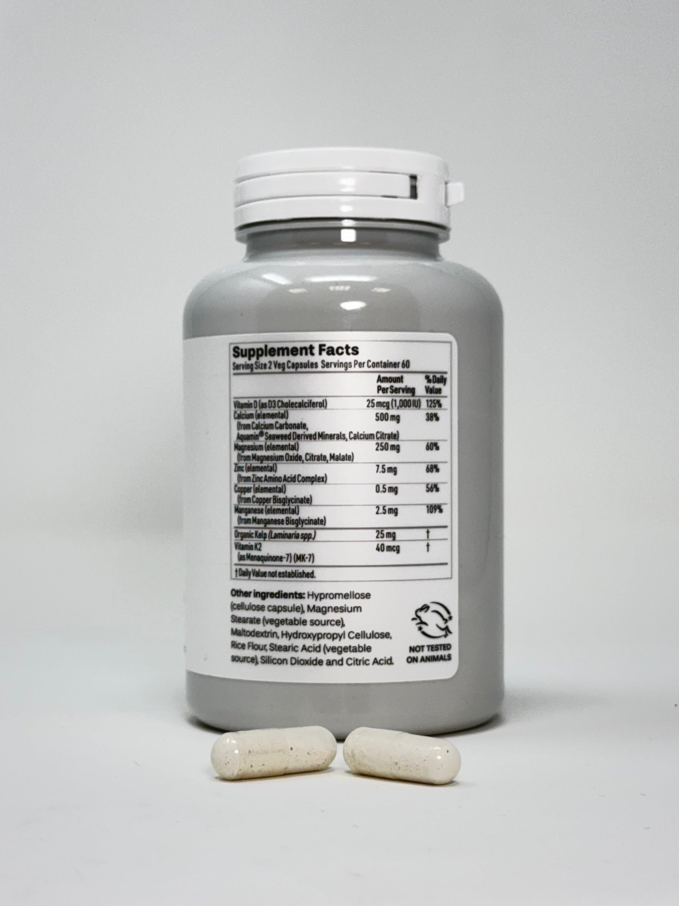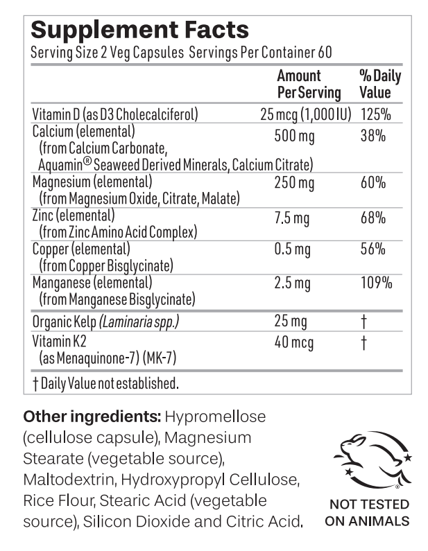 Vitamin D3, Calcium, Magnesium, Zinc, Copper, Manganese, Organic Kelp, Vitamin K2