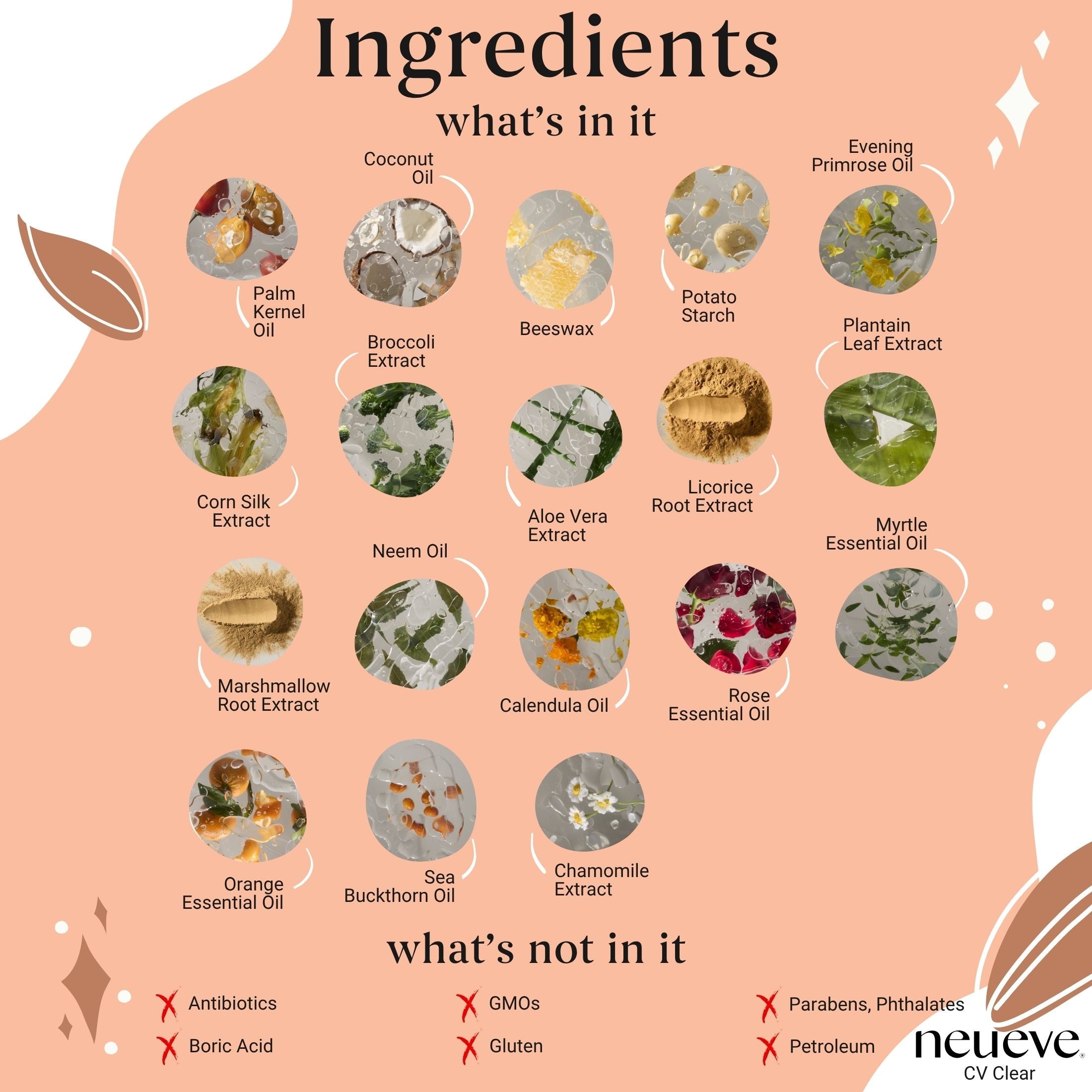 If you're experiencing burning sensations, discharge, and discomfort associated with cytolytic vaginosis (CV), NeuEve CV Clear offers a gentle, plant-based approach to supporting vaginal balance. Unlike approaches using boric acid, baking soda, or synthetic chemicals, this formula uses food-grade botanical ingredients designed to work with your vaginal microbiome.