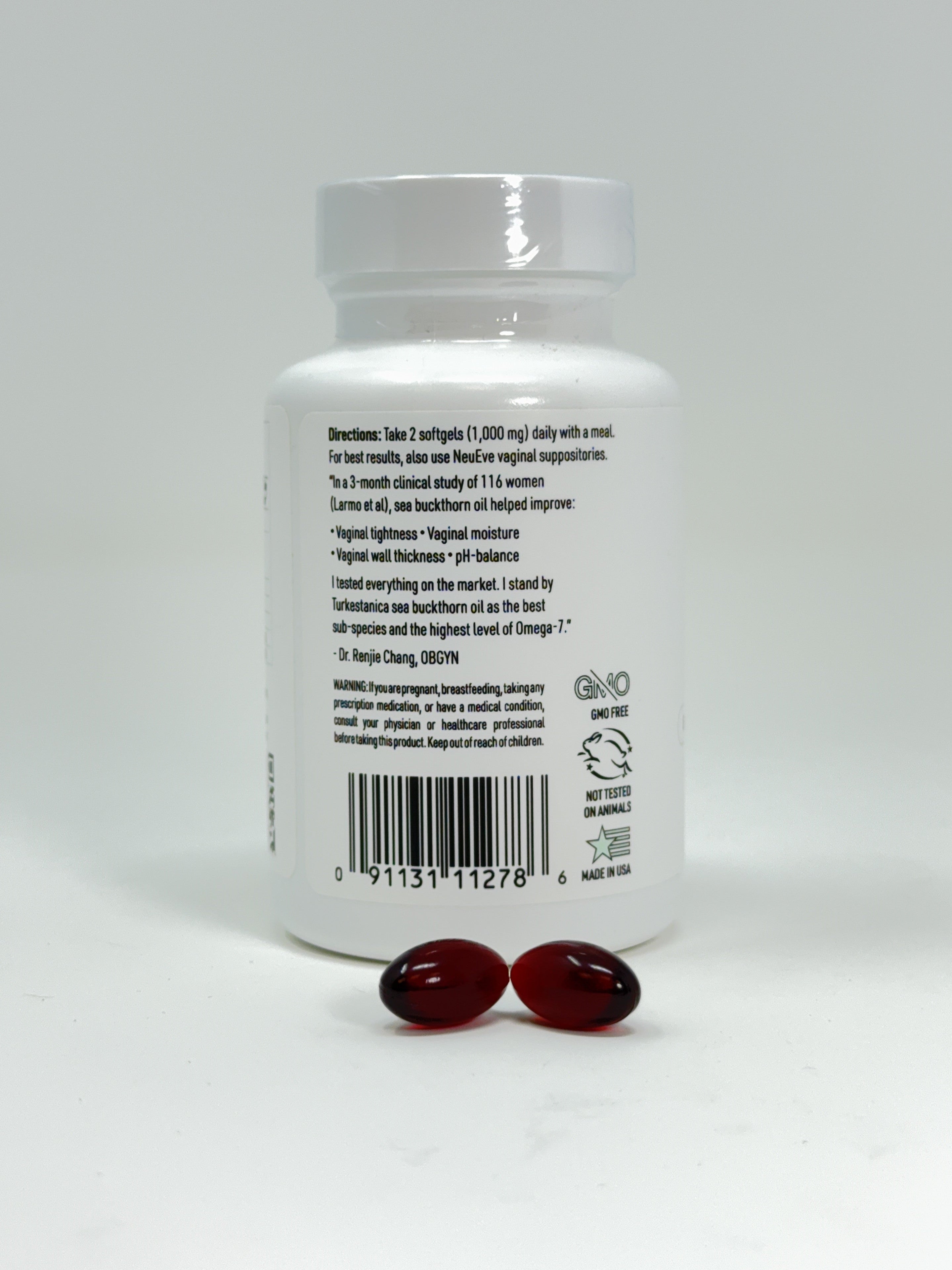 Sea buckthorn oil is one of nature's richest sources of omega-7 fatty acids—nutrients that may support mucous membrane health throughout your body. If you're dealing with vaginal dryness (especially post-menopausal), dry eyes, dry skin, or looking for metabolic support, this food-grade supplement offers comprehensive nutritional support from within.