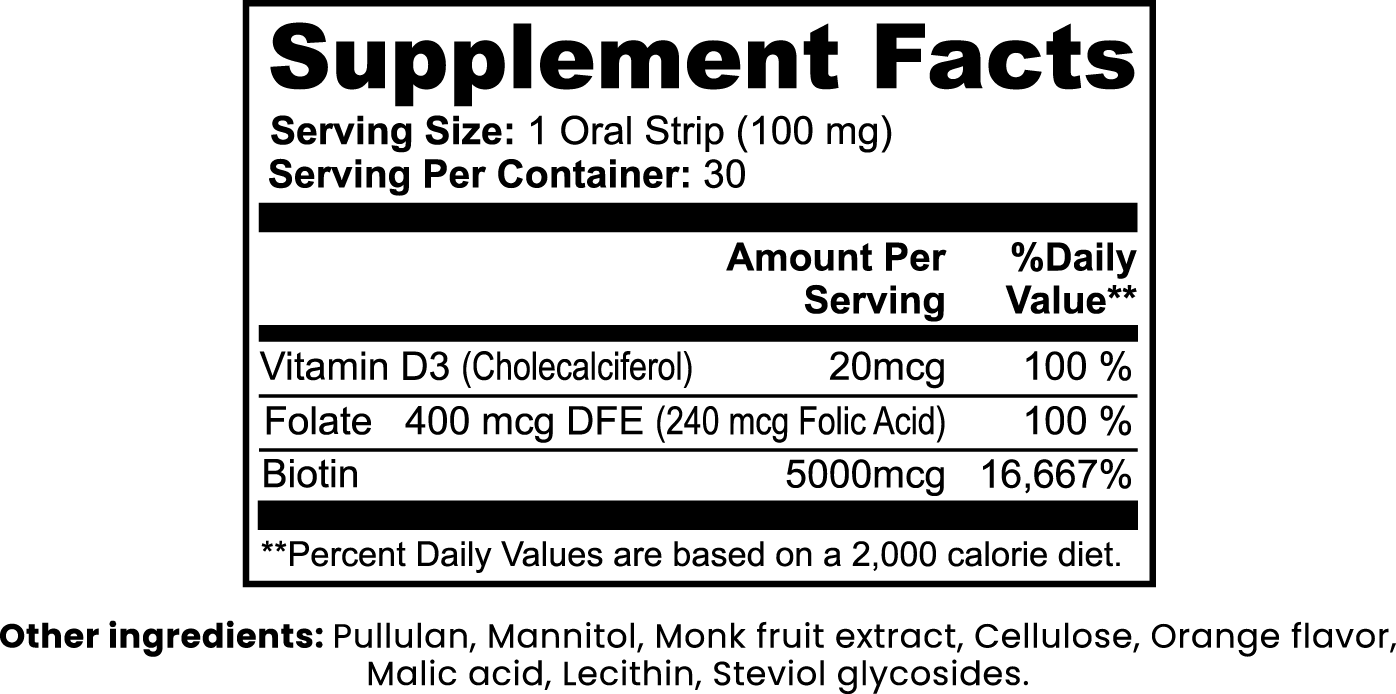 Hair, Skin and Nails Oral Strips: Biotin + Folate + Vitamin D3 for Beauty Wellness Support