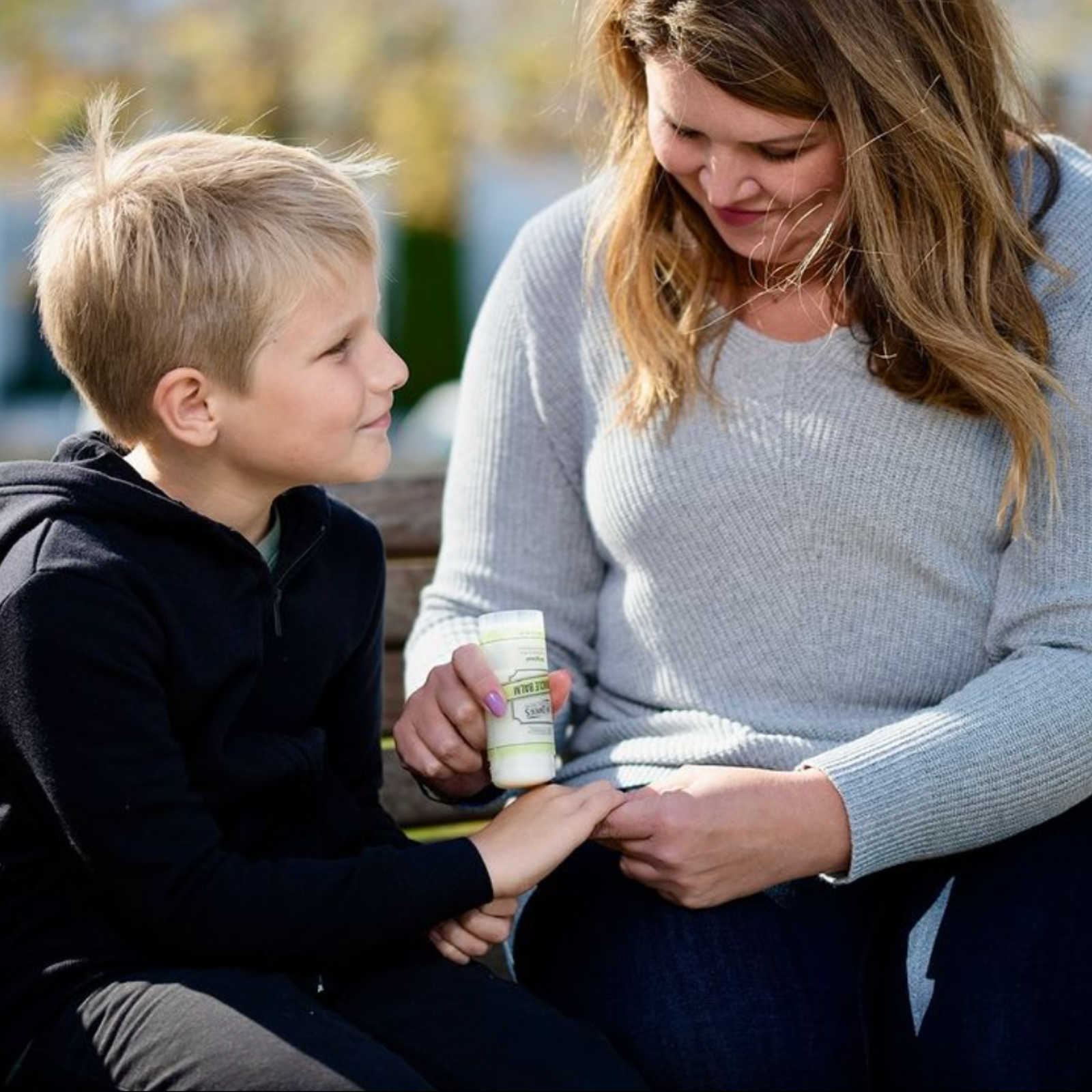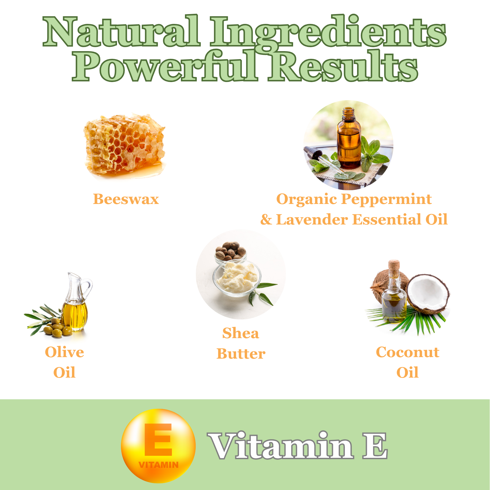 Organic Beeswax, Organic Extra Virgin Olive Oil, Organic Extra Virgin Coconut Oil, Organic Shea Butter, Vitamin E, Organic Peppermint & Lavender Essential Oils.