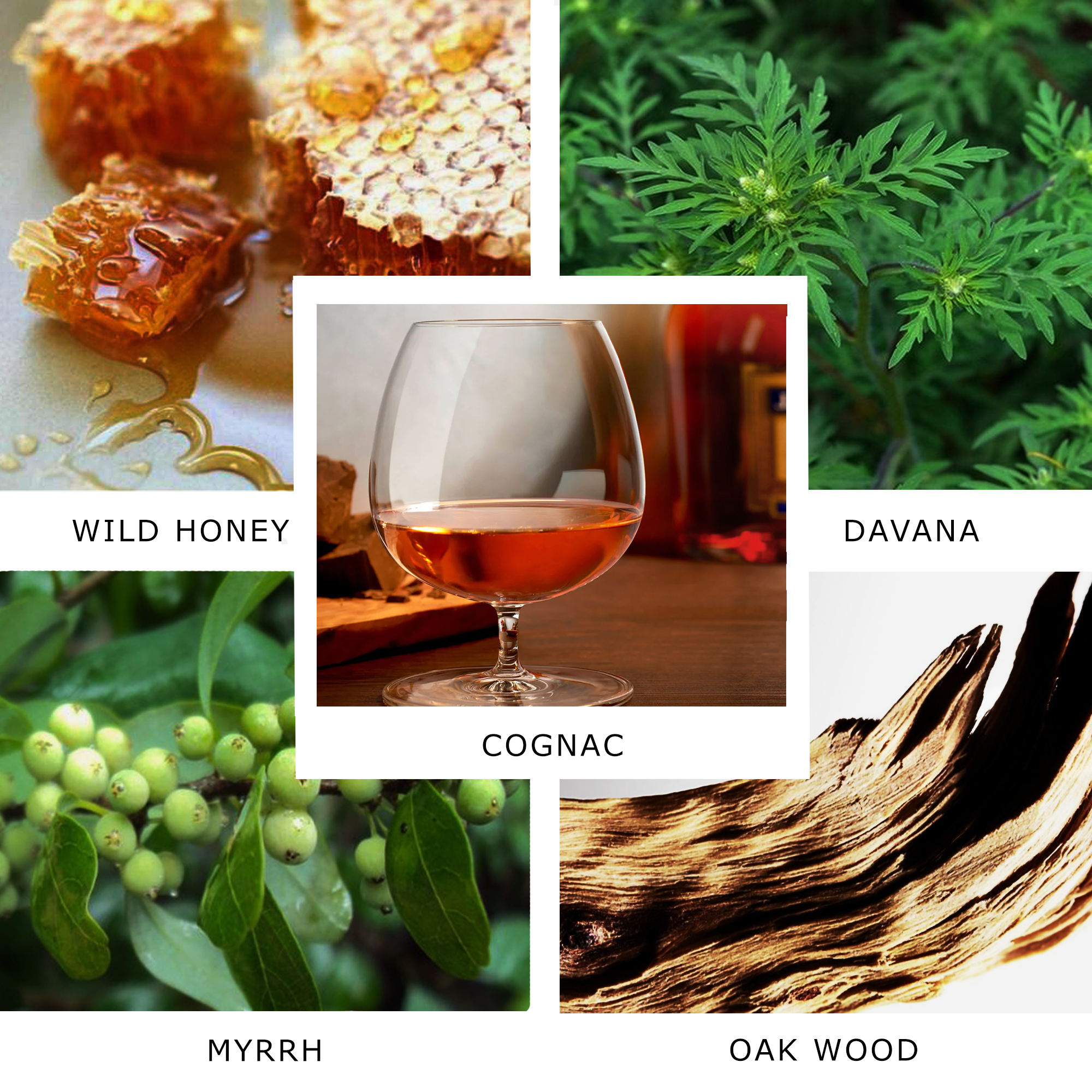 Cognac delivers a rich, boozy warmth—smooth and golden, like a velvet sip of aged spirit in low light. The Davana adds contrast, bursting with herbal brightness and a fruity-green nuance that feels wild and alive. While the Myrrh anchors it all with a smoky resinous swirl—sweet, balsamic, and just a little mysterious.