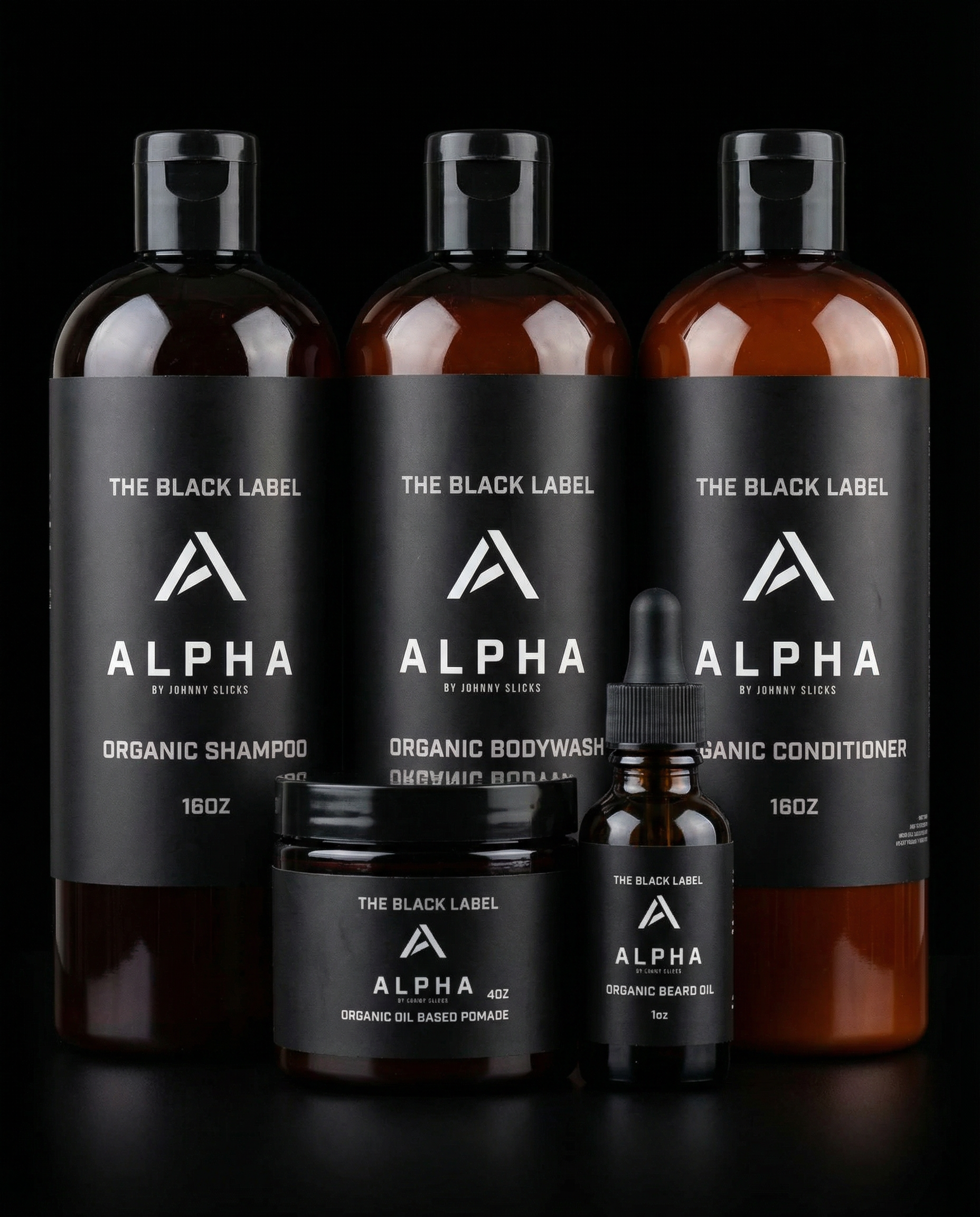 Five premium organic products. One unified Alpha Black Label identity. A complete head-to-toe, hair-to-beard grooming system that works as hard as you do — every single morning.