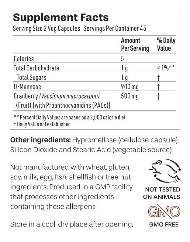 D-mannose is a naturally-occurring simple sugar. Research suggests it may help support urinary tract wellness by providing an alternative binding site for certain bacteria, which may then be naturally eliminated through urination.