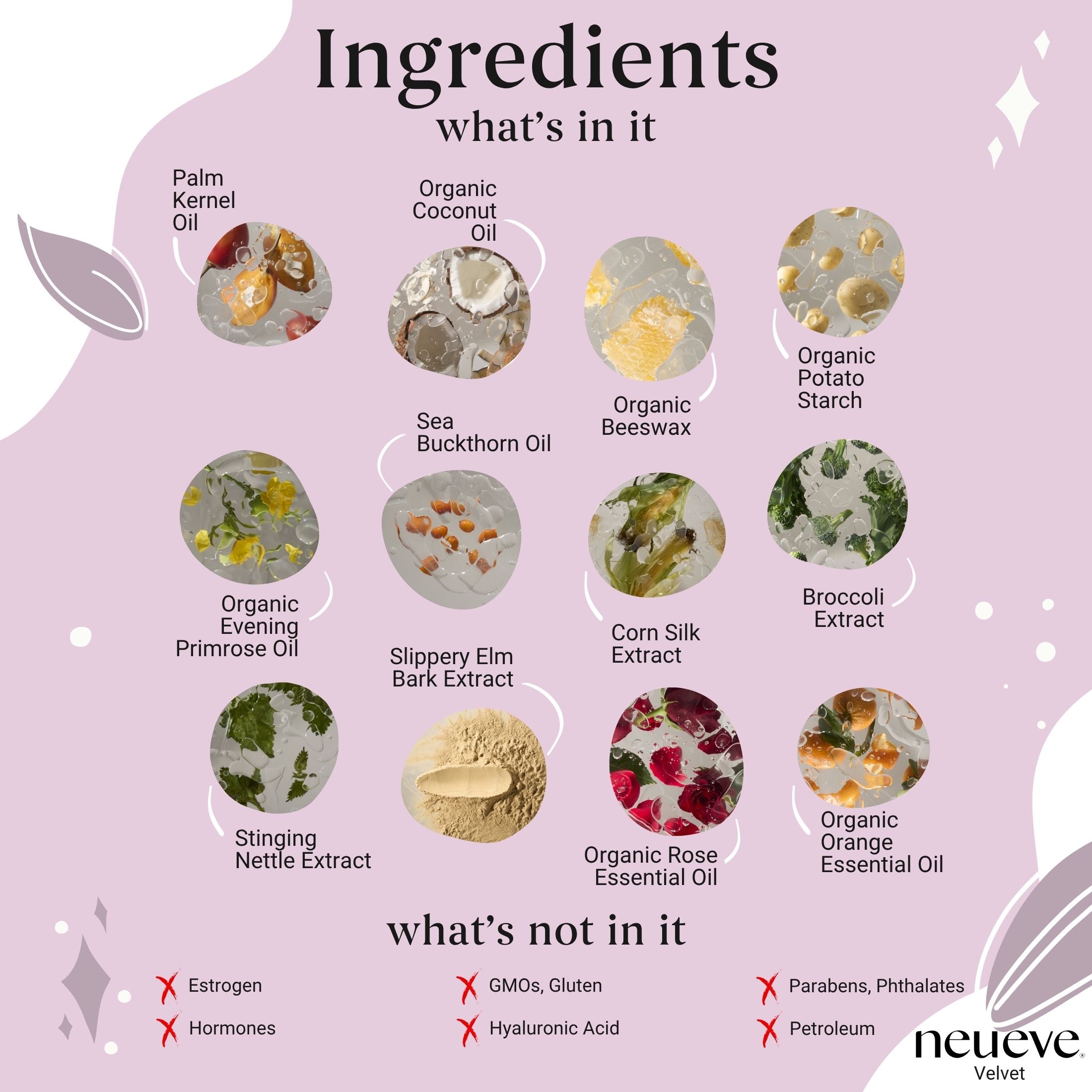 Developed by a gynecologist, NeuEve Velvet suppositories contain only 100% natural, food-grade ingredients. This means every component is pure enough to eat—because your body deserves nothing less, especially in such a sensitive area.